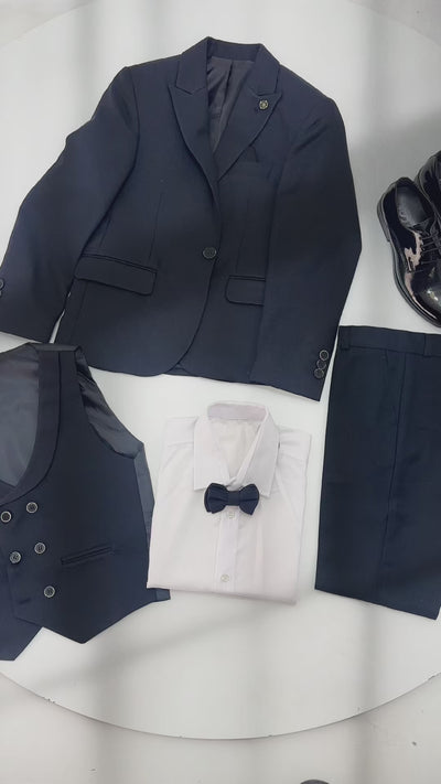 This five-piece set includes a jacket, double-breasted waistcoat, white cotton shirt, trousers, and pre-tied bow tie. Perfect for weddings, proms, communions, school events, or any special occasion where he deserves to shine.  Whether he's making a grand entrance or posing for photos, watch him do so with confidence and style thanks to this suit. Complete the ensemble with dress shoes from our premium boys’ footwear collection