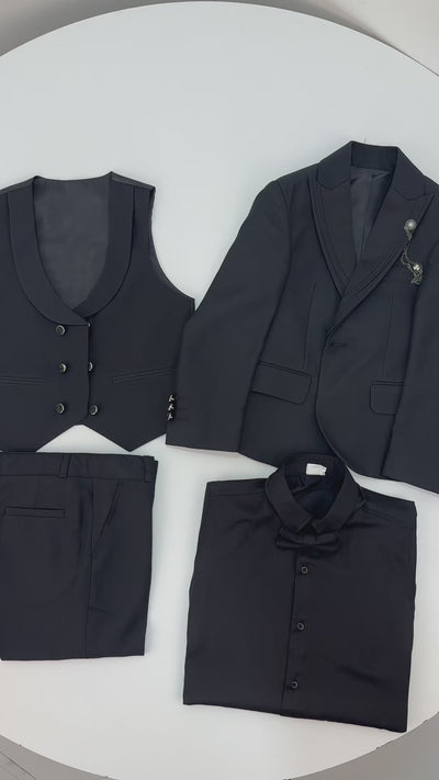 Boys’ 6-Piece Tuxedo Dinner Suit with Double Breasted Waistcoat - DAMATLIK - Black