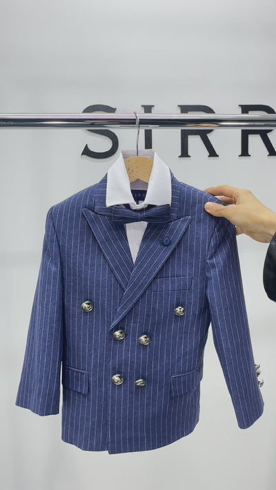 Let him steal the spotlight with this black pinstripe suit set for boys, designed by Sirri to impress at any occasion that calls for a classic yet stylish style. Featuring sleek stripes and a classic double-breasted configuration, the suit is tailored in a slim-fit cut that flatters his silhouette without restricting movement.