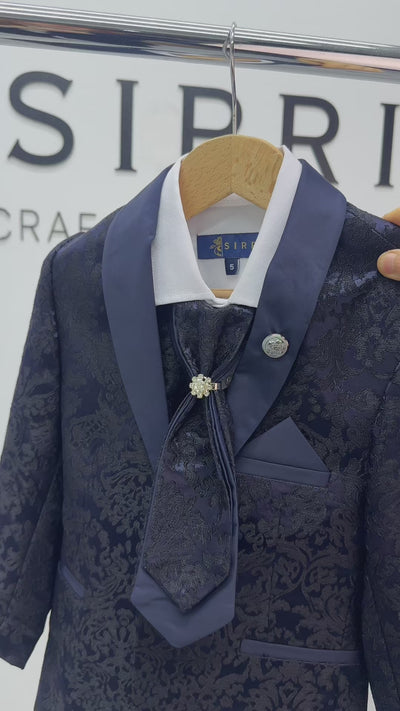 Boys Satin Lapel Paisley Floral Tuxedo Suit Set - Navy