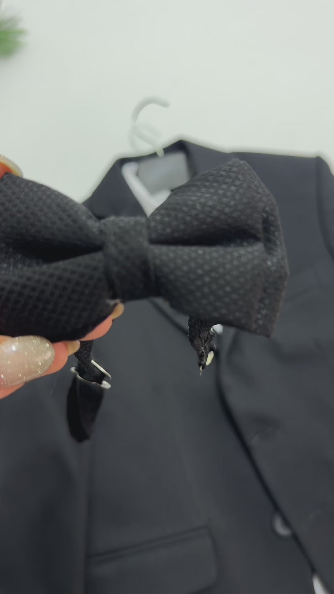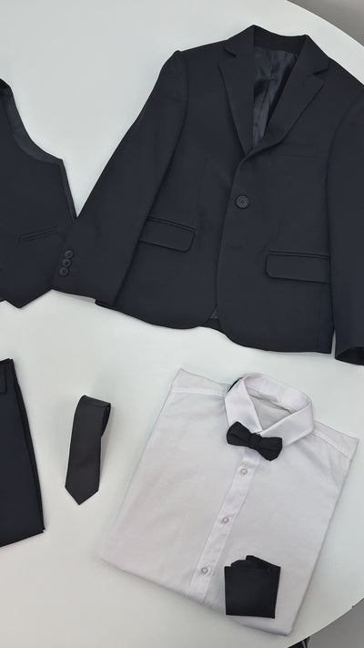 - The 7-piece set includes a jacket, a waistcoat, a white cotton shirt, trousers, and complementary suit accessories such as a pre-tied bow tie, necktie, and handkerchief.
