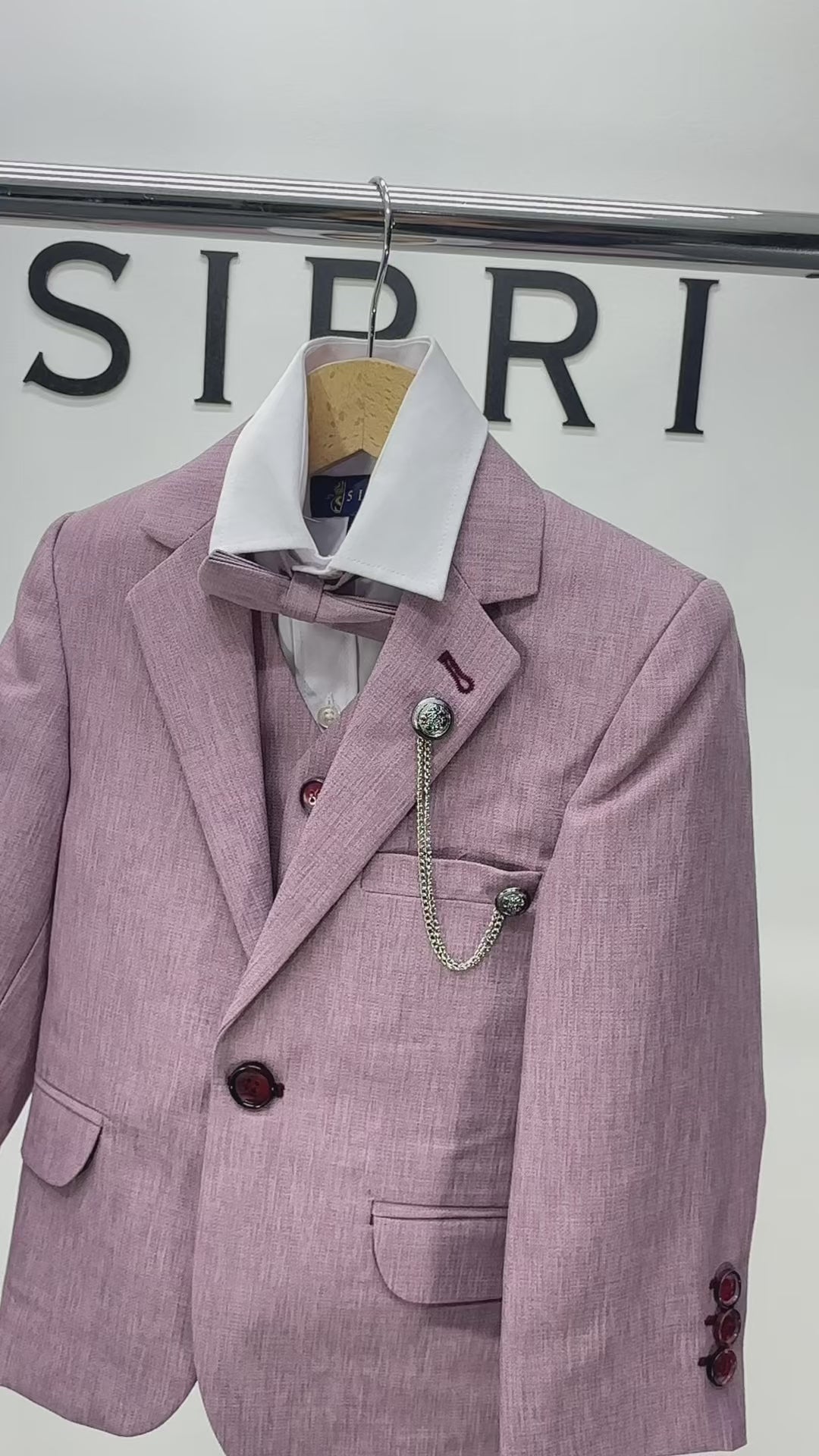 The 8pc includes a jacket, waistcoat, trousers, shirt, tie, bow tie, hanky and chain.