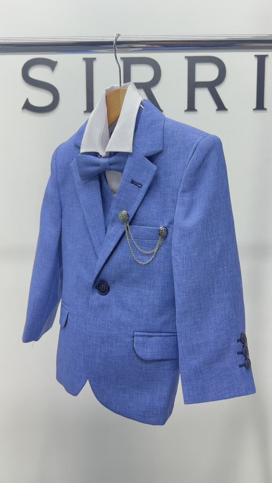 Step into sophistication with our classic 8-piece suit for boys, a timeless addition to your little gent’s formal wear collection. Tailored to perfection, this ensemble includes a sharp single-breasted jacket, a sleek vest, and matching trousers crafted from premium fabric that ensures both comfort and durability. It is versatile enough for any season and serves as the perfect backdrop for the suit's subtle, yet distinctive details, such as the elegant tie, bow tie, hanky and the contemporary chain accessory that adds a touch of modernity. This slim-fit suit is designed to fit a range of body types, from ages 1 to 16, offering sizes from slim to plus-size options. Whether he’s attending a wedding or celebrating a special occasion, this suit promises to elevate his style effortlessly. Pair it with our selection of boys dress shoes to complete your look.