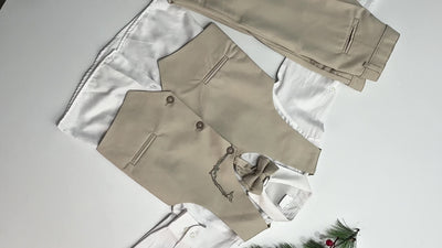 This boys' 4-piece slim-fit waistcoat suit set is a classic, versatile outfit perfect for special occasions like weddings, birthday parties, or family celebrations. Designed with attention to detail, the set includes a textured waistcoat, tailored trousers, a crisp white shirt and a matching bow tie. The textured fabric and neutral color add elegance, making it suitable for both formal and semi-formal events. Crafted for comfort and style, this suit ensures your little one looks sharp and feels confident.