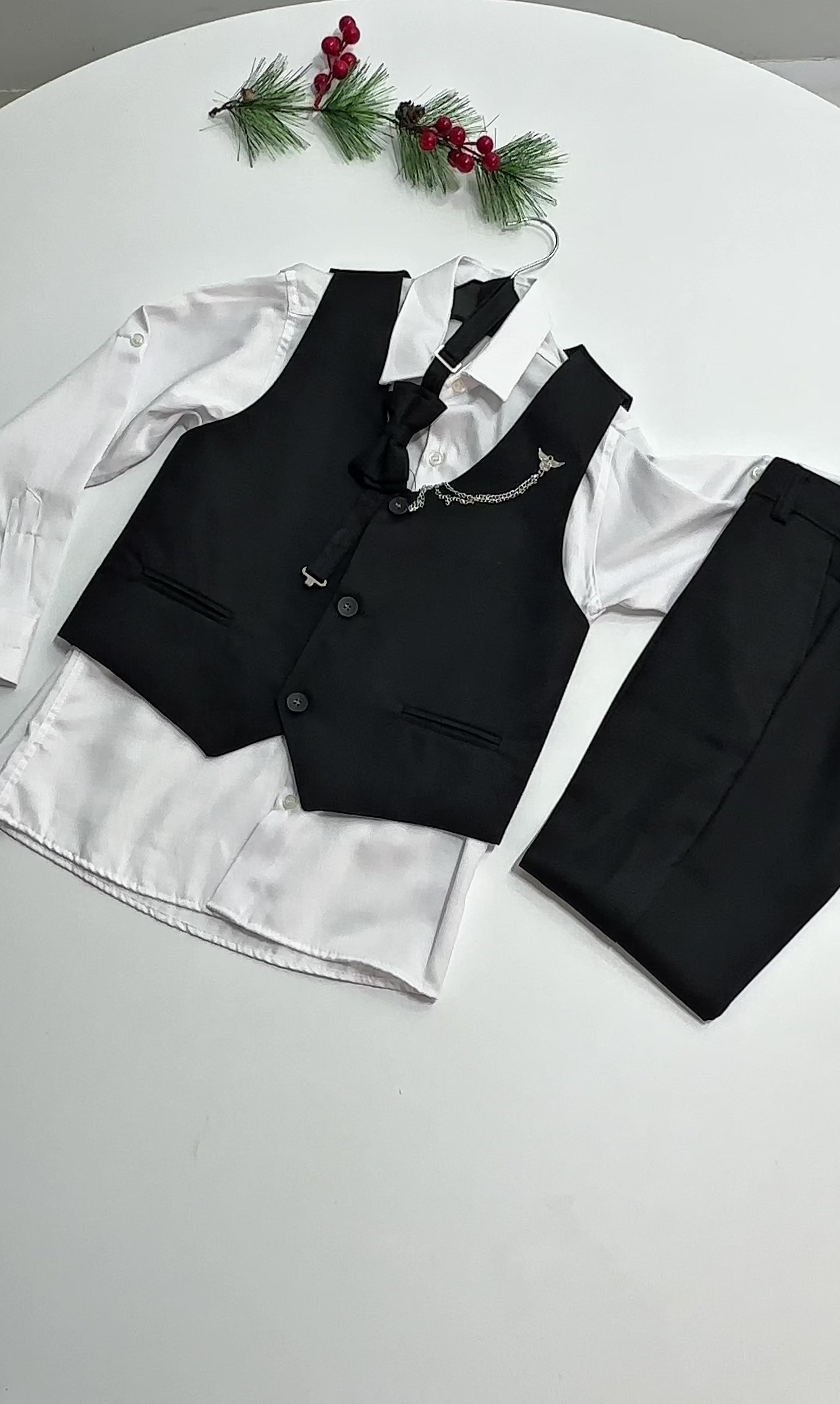 This boys' 4-piece slim-fit waistcoat suit set is a classic, versatile outfit perfect for special occasions like weddings, birthday parties, or family celebrations. Designed with attention to detail, the set includes a textured waistcoat, tailored trousers, a crisp white shirt and a matching bow tie. The textured fabric and neutral color add elegance, making it suitable for both formal and semi-formal events. Crafted for comfort and style, this suit ensures your little one looks sharp and feels confident.