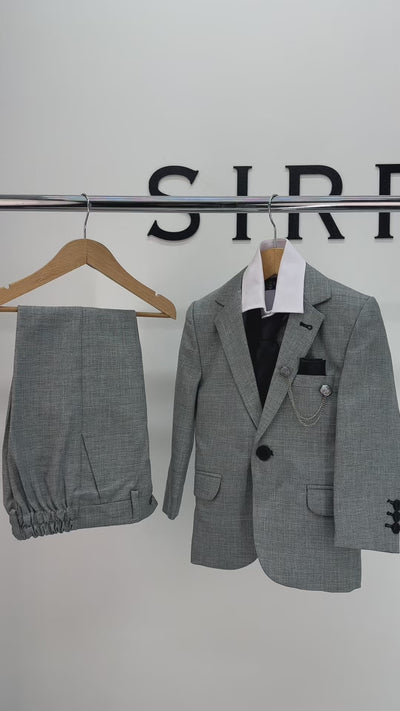 Step into sophistication with our classic 8-piece suit for boys, a timeless addition to your little gent’s formal wear collection. Tailored to perfection, this ensemble includes a sharp single-breasted jacket, a sleek vest, and matching trousers crafted from premium fabric that ensures both comfort and durability. It is versatile enough for any season and serves as the perfect backdrop for the suit's subtle, yet distinctive details, such as the elegant tie, bow tie, hanky and the contemporary chain accessory that adds a touch of modernity. This slim fit suit is designed to fit a range of body types, from age 1 to age 16, offering sizes from slim to plus-size options. Whether he’s attending a wedding or celebrating a special occasion, this suit promises to elevate his style effortlessly. Pair it with our selection of boys dress shoes to complete your look.