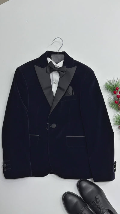 Boys Velvet Blazer with Satin Peak Lapel – Slim Fit Tuxedo Jacket for Weddings & Formal Occasions