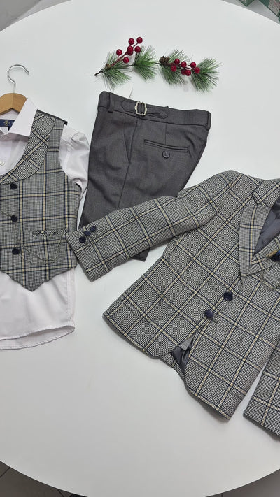 This SIRRI windowpane check retro suit for boys designed by Doctor Junior has the most stylish colour combination to create an irresistibly fashionable yet elegant ensemble. The slim-fit check jacket paired with a matching double-breasted waistcoat trousers creates an effortlessly sleek outfit that can be worn any time of year, especially on those special occasions where he needs his fashion game strong but not too trendy. This formal three-piece set is ideal as a Christmas, Easter, pageboy, dinner, prom, or church services outfit.